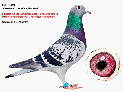 三、NL11-1185721班母 “黃金迪克直孫 721”,考布曼本舍作出鴿,其母親NL09-4773372 “莫拉克小姐”斑,為大名鴿”黃金迪克號B04-1389690”直女,在2011年的第一場大賽(拉文斯汀)11.509羽即獲得冠軍;其他成績史棟貝克11.586羽23位、聖特魯登10.319羽43位,可是後來在賽季中期的一場比賽歸巢途中,翅膀不幸受傷!轉而移入種鴿舍育種。