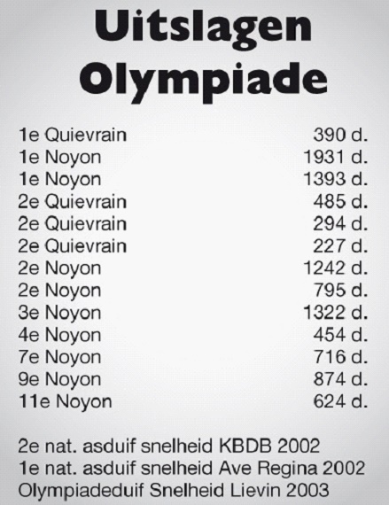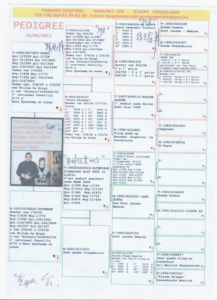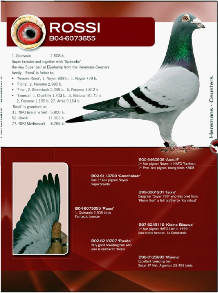父鴿:B04-6073655 “羅西”灰,2.508羽冠軍、158羽亞軍、2.204羽31位、1.969羽63位,售予荷蘭漢士.艾爾肯普鴿舍。賀列曼-裘斯特標誌鴿。