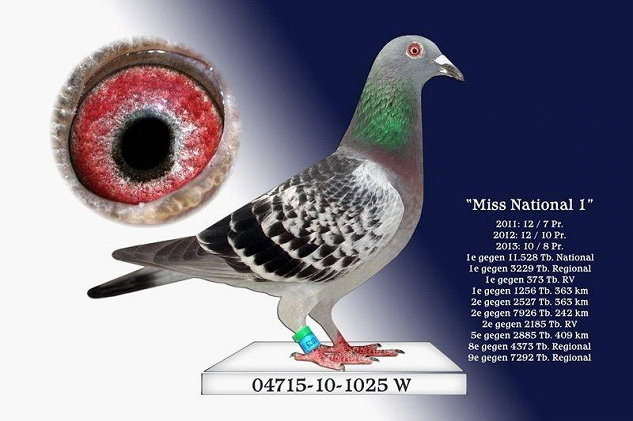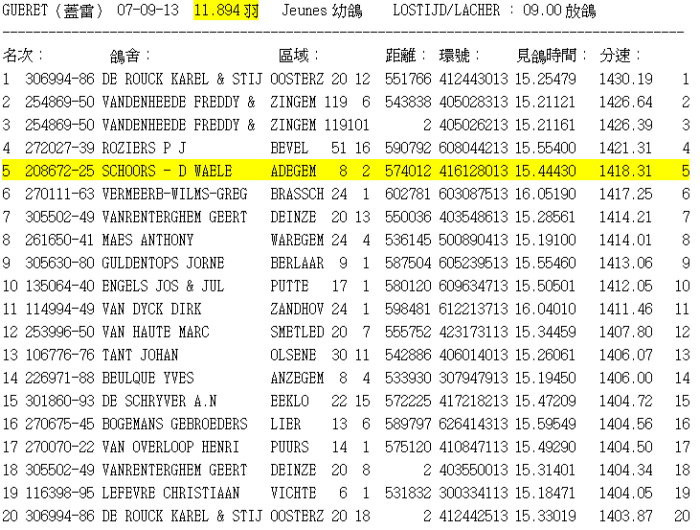 1位 Nat. Gueret 蓋雷(幼鴿) 全國A區 3.000羽 574公里 全國5位(11. 894羽)