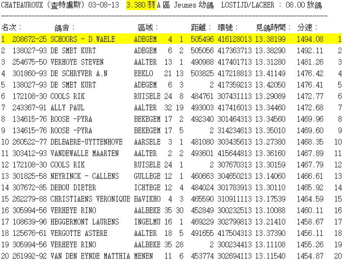 1位 Nat. Chateauroux查特盧斯(幼鴿) 全國A區 3.380羽 505公里