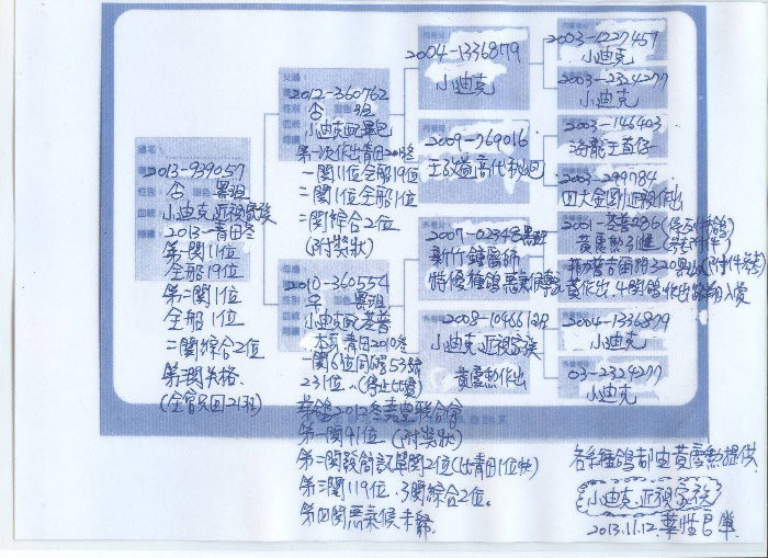 今(2013)年冬季賽改參賽青田聯合會,第一關獲得單關11位全船排名19位,第二關單關冠軍又是全船排名總冠軍,而兩關成績排名綜合2位,結果又是同樣的命運(第三關殘存21羽結束)沒下來。真的很鬱悶。