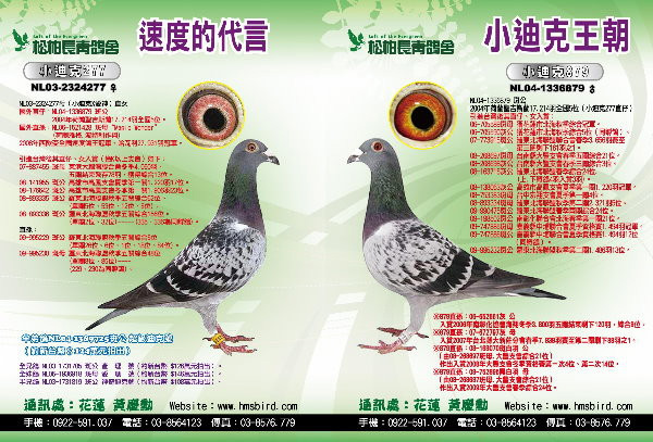 話說葉兄此系鴿皆是來自我家的考布曼小迪克家族,2008-104661班母是小迪克879配小迪克277(母.子近親配對作出.,本身近視眼),連續作出兩次皆有優異成績表現:第一次是2010年青田冬季賽第一關單關6位,同孵鴿231位,第二關因放鴿船跑錯位置,提前結束比賽。第二次再作出即是2012年嘉豐聯合會冬季賽三關綜合2位的成績。