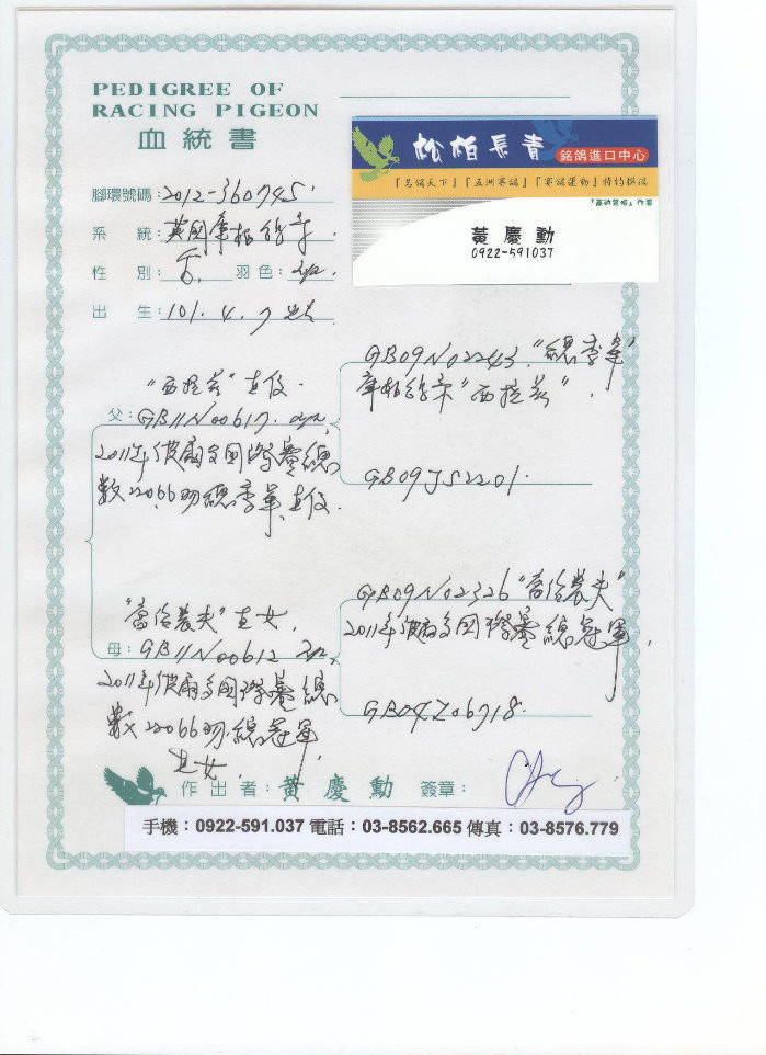 好友稍來喜訊,他跟我引進的英國傑夫.庫柏鴿系幼鴿12-360745班公(西拉茲直仔X喬治農夫直女),第一次作出2013-171563班公,參賽台南市佳里區佳興分會冬季賽(放北海)第四關全會返回55羽(全會歸返率15.36%),獲得四關綜合亞軍(單關:4位、38位、163位、4位)。