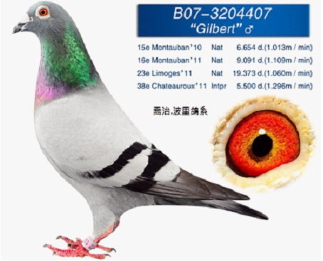 另外喬治.波里(Bolle Georges)鴿系在國內競翔的優異表現有目共睹,尤其遇到惡劣氣候每每有令人意想不到的突出成績是鴿友夢寐以求的鴿系。"吉伯特"(Gilbert)是路克.西翁鴿舍珍藏的一羽喬治.波里優秀記錄鴿(如下圖),我問他鴿舍保留幾羽直仔.女後代,表明首度跟他作生意希望能引進"吉伯特"的直仔.女各一羽,讓他憑自己誠意回家挑戰一公一母給我。