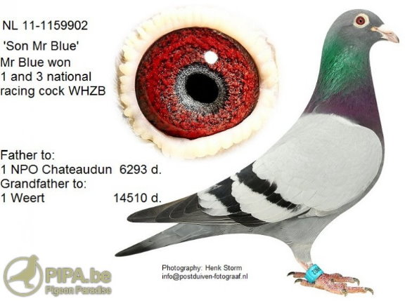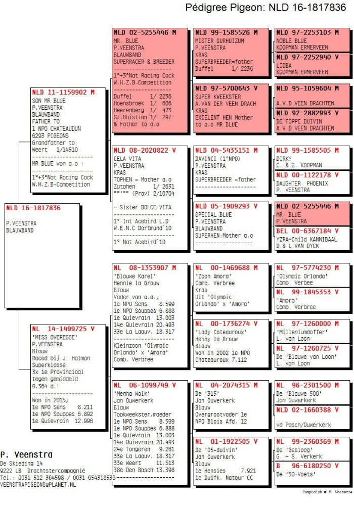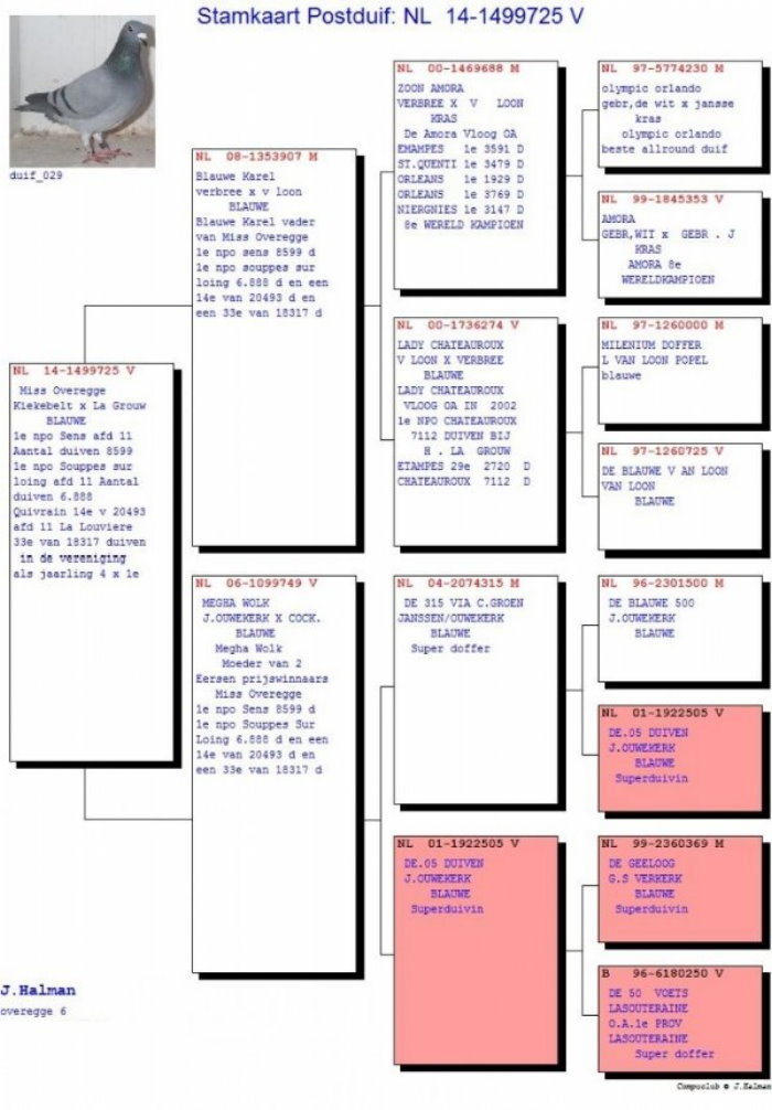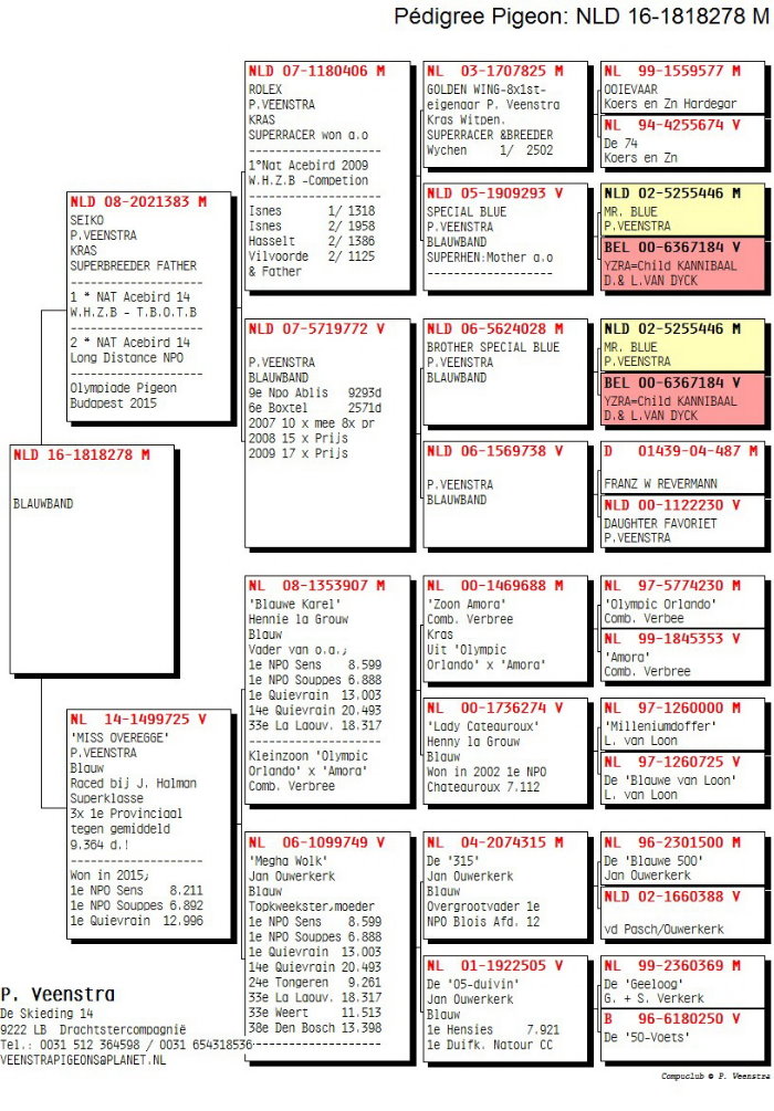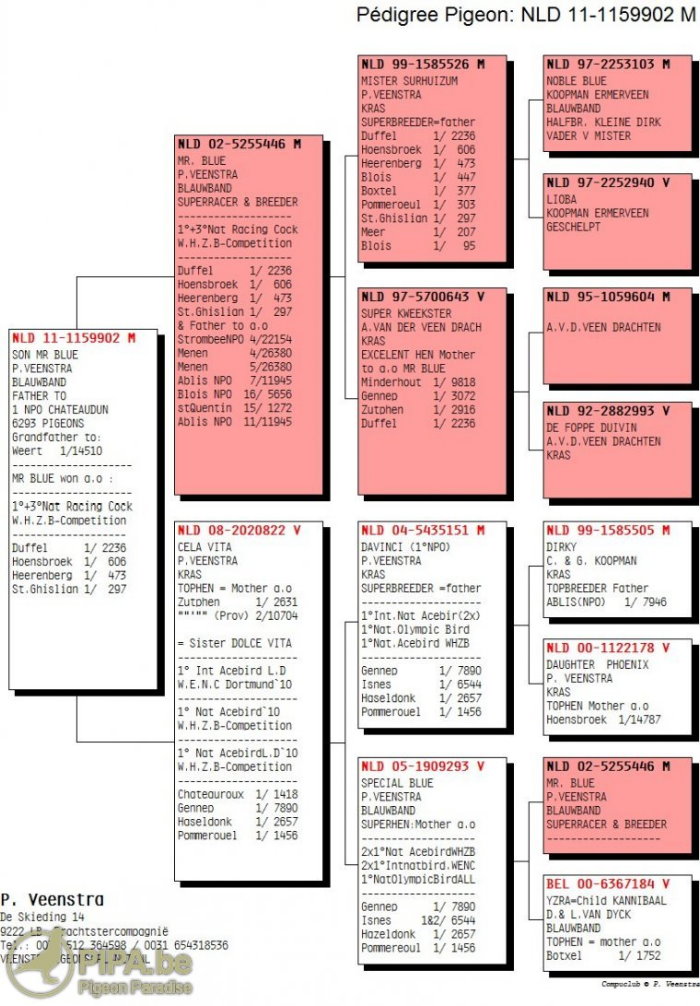 其父親NL97-5774230O lympic Orlando奧林匹克奧蘭多-2001奧林匹克國際全能鴿王冠軍,1999 WHZB全國速度鴿王3位,查特魯NPO全國5.758羽6位,波治NPO全國6.466羽9位,波治NPO全國13.000羽13位,佛布利.柯&彼得Verbree Co & Piet父子作翔。