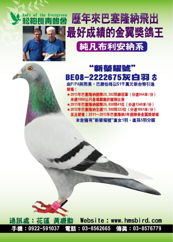 這羽新榮耀號BE08-2222675灰白羽公鴿,是比利時近十幾年在超長距離巴賽隆納國際賽上,大家公認飛得最好的一羽長距離鴿,不但是入賞巴賽隆納國際賽冠軍,更是獲得至高無上的三年巴賽隆納國際賽金翼獎鴿王冠軍的頭銜,在血源上更是無以倫比的純種凡布利安納系,可說是集合一身的榮耀加上高貴無比的貴族血源,在各方爭相搶購下,最後是以$25萬歐元(當時匯率相當於$1千萬新台幣)為比利時PIPA與雨果•巴滕伯格鴿舍成功引進。