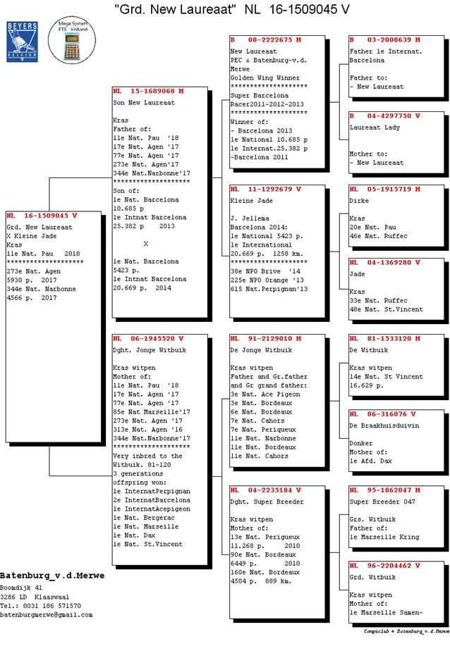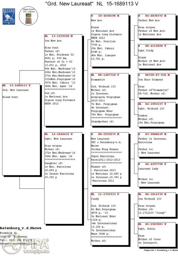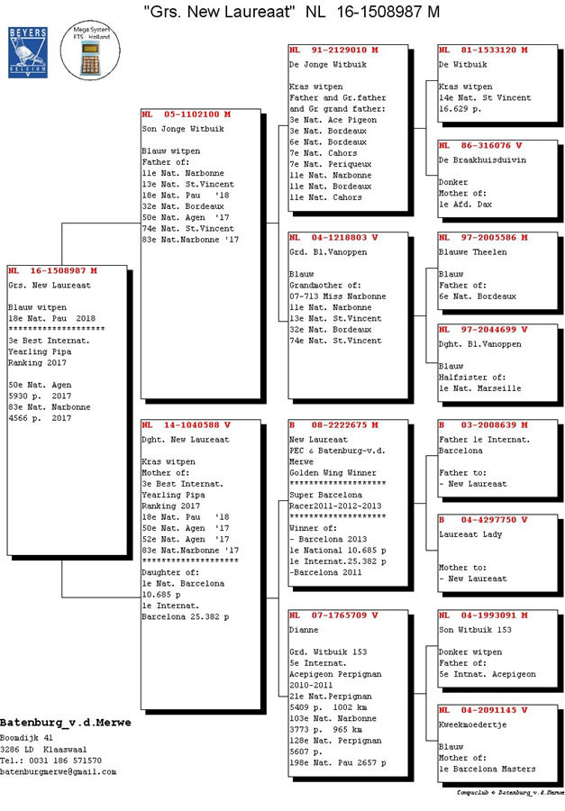 獲得2016年波品納荷蘭全國4.029羽(一歲鴿)季軍,國際賽12.689羽5位,今(2018)年再度獲得荷蘭波城全國3.530羽39位。