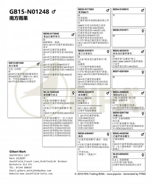 巴賽隆納英格蘭全國冠軍吉伯特 馬克(Gilbert Mark)鴿舍,該舍冠軍鴿GB15-N01248斑公,是在比利時時間7月8日(星期日)下午14時47分52秒歸巢,翔距1131.89公里,創下平均分速800米/分,這羽賽鴿就在去(2017)年還獲得波品那全國冠軍,也是“新榮耀號”的直外孫。