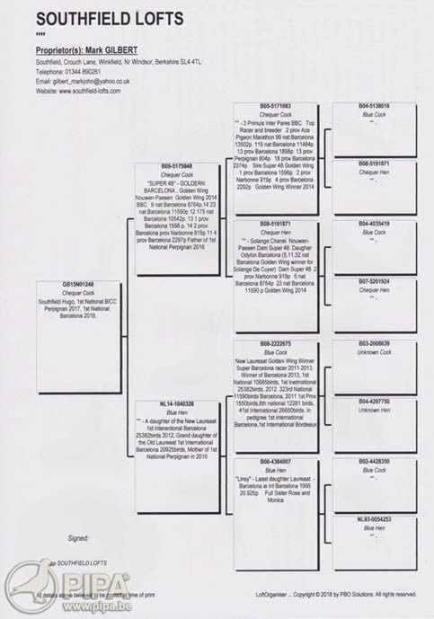 這羽雌鴿名為“南方鐵娘子”(Southfield Iron Lady GB16E-26230灰母),其父親NL14-1040577灰公為路克.威爾斯(Luc Wiels)的巴賽隆納國際冠軍“新榮耀號B08-2222675灰白羽.公.”的直子,母親B11-4278488灰母為倚天.梅爾浪的塔碧斯國際賽亞軍“星光”(Starlight)直女。這羽雌鴿擁有優秀獲