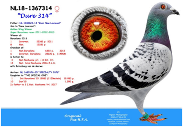 母鴿:NL14-1687676斑母,為2015年巴賽隆納國際賽19.083羽冠軍”特殊的一個”當日唯一歸返鴿配(新榮耀號”X”小碧玉”)直女。