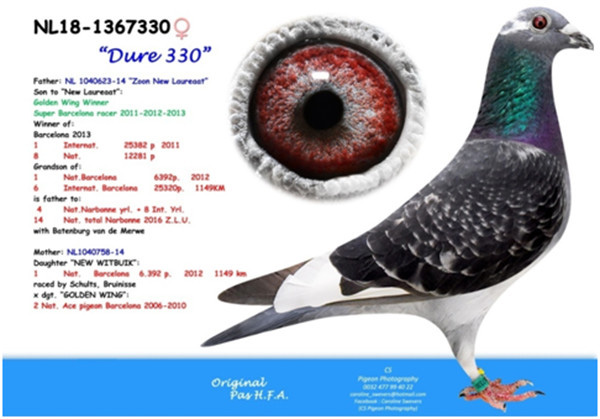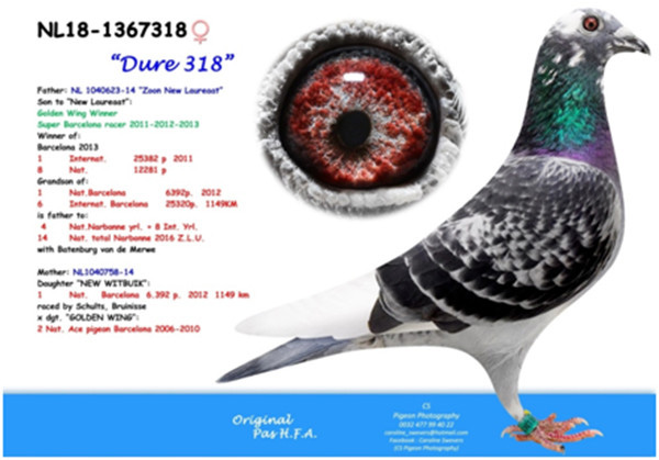 母鴿:NL14-1040758斑母,2012年巴賽隆納全國6,393羽冠軍1,149公里,國際25,438羽6位直女。