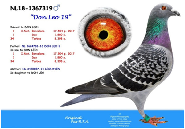 父鴿:NL16-3624783斑公,2017年巴塞隆納國際17.094羽總冠軍”蘇美爾戰將”(歷年來最艱難的一次巴塞隆納國際賽)直仔。