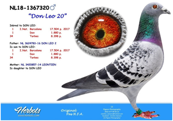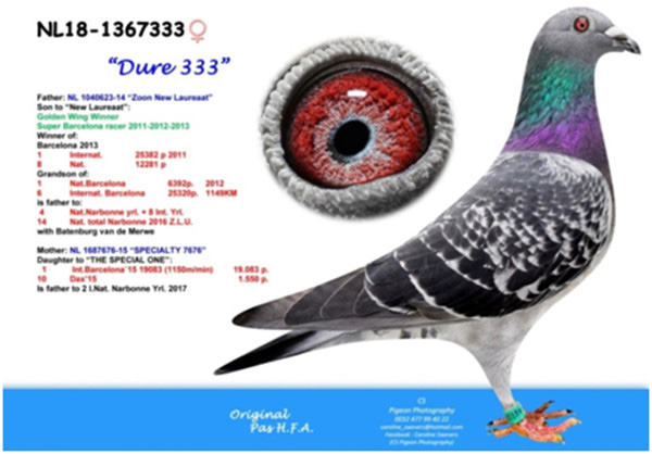 母鴿:NL14-3420857斑母,2017年巴塞隆納國際17.094羽總冠軍”蘇美爾戰將” (歷年來最艱難的一次巴塞隆納國際賽)直女。