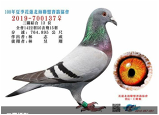 八、2019年花蓮北海聯盟夏季殘存15羽之1 伯馬(新榮耀號直女236)直孫,林志成作出。