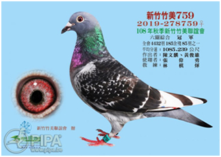 九、2019年新竹竹美聯誼會秋季4.432羽六關綜合冠軍19-278759斑白羽.母,全會殘存85羽。(新榮耀直孫X小迪克879直女),陳文麟、黃俊雄作出。