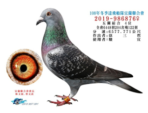 七、2019年宜蘭聯合會冬季賽(全會6.448羽剩下122羽)綜合 4 位 19-986876斑母(莊天惠+林東峰)是賓尼.史帝文鴿系”蓋雷B08-4216930灰公”直孫。
