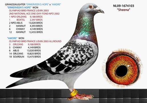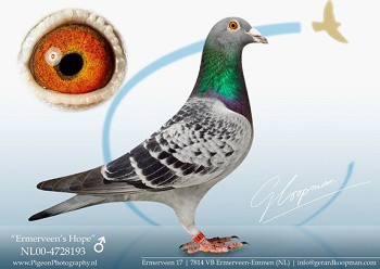 “艾瑪文之光”NL00-4728193 (Ermerveen's Hope)斑公,獲得2002年荷蘭一日賽全能鴿王冠軍,2003年奧林匹克代表鴿,亞比利斯(Ablis)586公里13.022羽亞軍、奧爾良(Orleans )639公里9.188羽冠軍、布克斯特爾(Boxtel)163公里2.397羽冠軍;哈奴特(Hannut)259公里4.394羽亞軍。