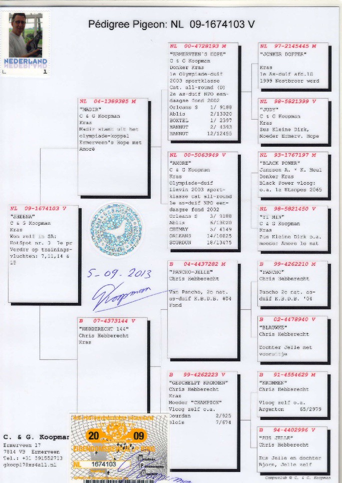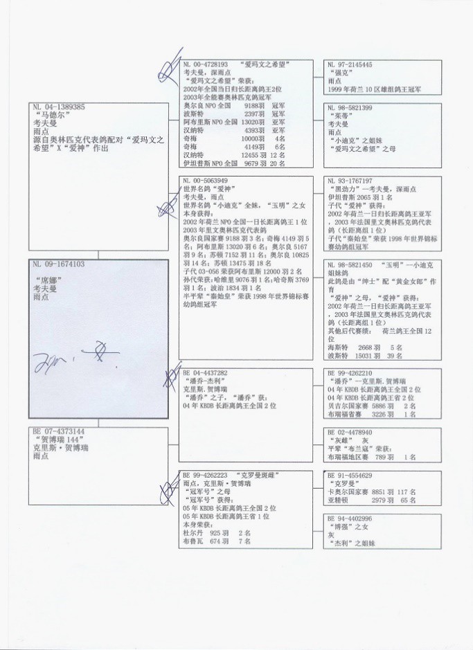 祖父鴿:NL00-4728193班公 ”艾瑪文之光” 祖母鴿:NL00-5063949班母 ”愛神號”