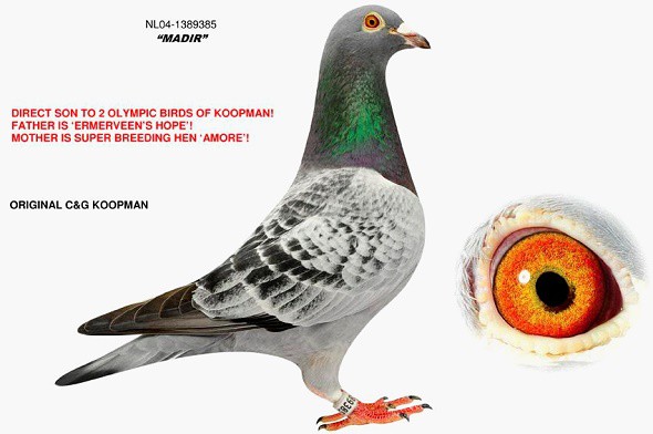 ●父鴿:NL04-1389385班公 “馬德爾”為考布曼超級種鴿”艾瑪文之光”× ”愛神號”