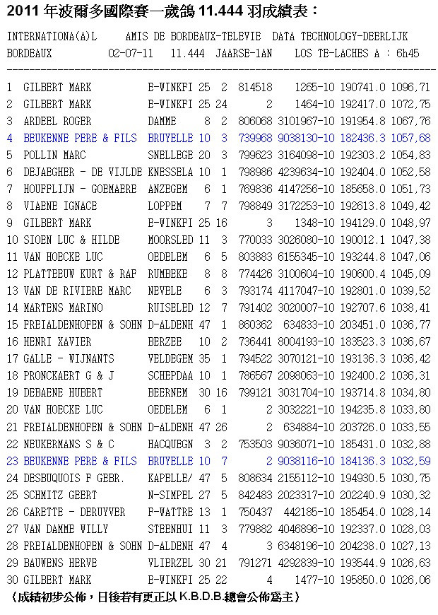 我進一步細查比利時國家賽前20名成績,發現獲得一歲鴿6.217羽全國亞軍(國際11.444羽4位)的選手鴿來自比利時9開頭的海納省(HAINAUT)的貝肯尼父子(BEUKENNE PERE & FILS)鴿舍,這個鴿舍優異的表現,獲得比利時一歲鴿全國前20名中第2位及18位,絲毫沒有受到空中距離不利的影響,而更難能可貴的是在當地海納省僅有3羽鴿子擠進全國前20名中,貝肯尼父子鴿舍即獨佔2羽,相當的傑出表現,尤其是2011年的波爾多(Bordeaux)國際賽是上午6時45分放鴿,貝肯尼父子鴿舍的空中距離739.968公里,亞軍鴿B10-9038130班公(如照片)是當晚18時24分36秒打下鴿鐘(足足飛翔11小時又39分鐘)分速才1057.68公尺/分,算是很困難的飛翔,其他比利時強豪有:馬克.波林鴿舍入賞一歲鴿11.444羽5位、霍夫林鴿舍7位、路克.西翁10位、修伯特19位。