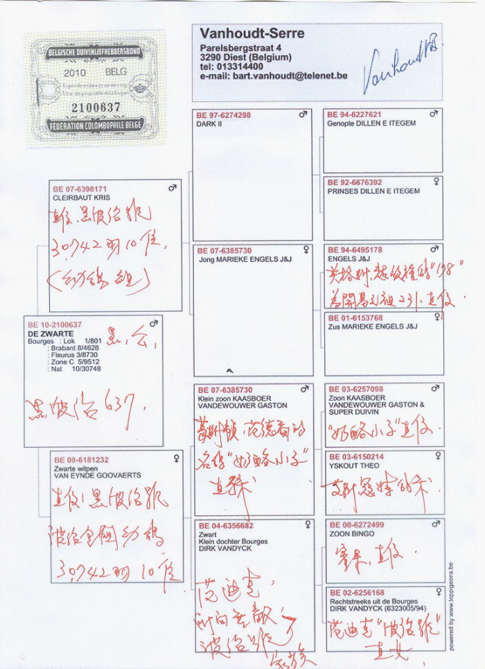 母鴿:B09-6181232黑白羽 母 為葛斯頓.范德維爾鴿舍黃金種鴿”奶酪小子”直孫×范迪克超級種鴿”波治號”直孫,並作出直仔”黑波治637”獲得2010年比利時波治II全國幼鴿組30.742羽10位。