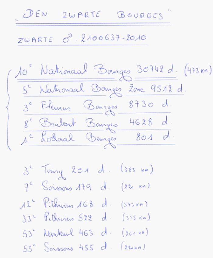 獲得2010年比利時波治II全國幼鴿組30.742羽10位。