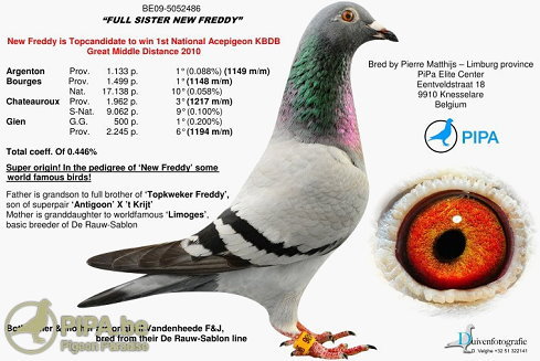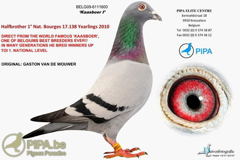 這羽新出現的超級種鴿就是”奶酪I號”B09-6111600灰公,牠本身是2010年波治17.138羽全國冠軍的半兄弟,比利時最好的種鴿,為葛斯頓.范德維爾鴿舍中神奇的“奶酪小子”直子!整個家族鴿系中已產生多羽全國冠軍鴿!