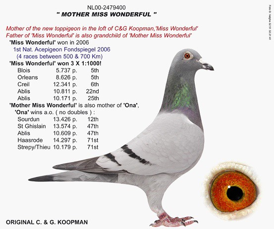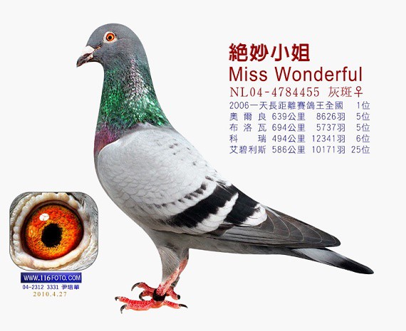 直女(+曾孫女)奇妙小姐NL04-4784455 (Miss Wonderful)2006年獲得Fondspiegel鴿報票選全國當日賽(500~700公里)鴿王1位。