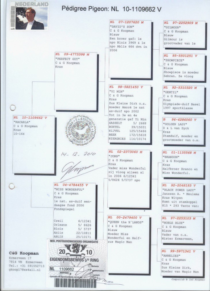 3.“愛瑪NL05-1936918班母”(考布曼父子鴿舍):在2009年PIPA的一場《臥虎藏龍》的拍賣會上以30,400 歐元的高價被拍出!~“愛瑪”的直孫代榮獲: 波爾多全國三大區18.023 羽冠軍(伯根地區的彼得斯作翔),且領先亞軍2個多小時。