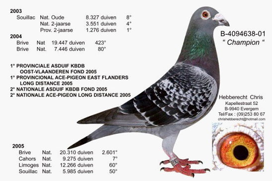 “冠軍號”B01-4094638班公,2005年比利時K.B.D.B.全國長距離鴿王亞軍。