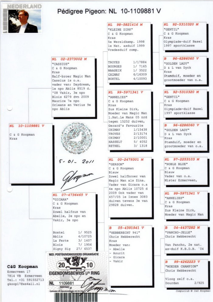—外祖父鴿:NL00-2479301班公"傑森",其全妹鴿"荷蘭女皇"作出子代"奇妙小姐"獲得:
