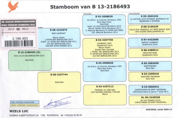 這羽"迪亞哥巴賽隆納號"在上籠的時候,已經很好地收到激勵了。事實上,盧克的一位朋友說過:這羽鴿子看起來很棒,他的狀態已經很好了。他看起來乾淨俐落還很機敏,是一羽正處在很好狀態的鴿子。說實話,可能你不會感到驚訝,這種類型的鴿子在鴿友中非常受歡迎。他獲得了許多頂級獎項,也擁有很好的血統。他的父親是亞曆克斯.蘭斯(Alex Rans)鴿舍的1995年波爾多國際冠軍"亞瑟"(Arthur)的血系。母親是卡羅.吉賽布賴特(Dr. Carlo Gijselbrecht)鴿舍的1995年巴賽隆納國際冠軍"巴賽隆納榮耀號"(Laureaat)的孫代。