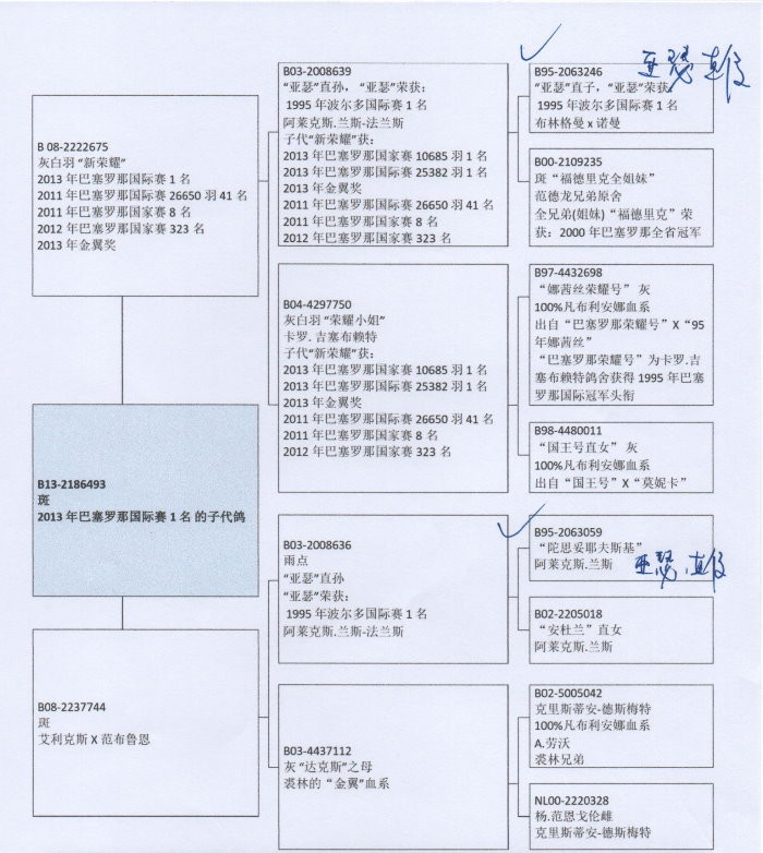 2013年巴塞隆納國際賽25.382羽總冠軍鴿BE08-2222675 "新榮耀號" 血統書。