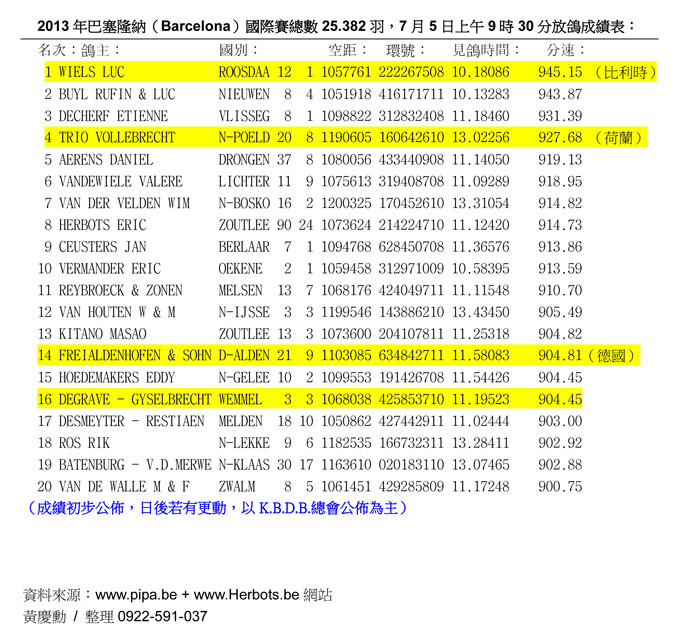 2013年巴賽隆納國際25.382羽總冠軍(分速944米/分)未達1000公尺是場艱難的競翔比賽。