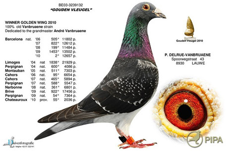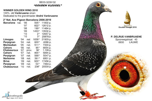 巴塞羅那國際金翼獎乃是頒發給“第一指定鴿名次最優者”,表示不只要飛得好,還要看得準,指定得準比利時老將帝魯-凡布利安娜(Delrue- Vanbruane)的2003年生七歲大黑斑老雄B03-3239132班公 “金翼號”贏得2010年7月2日巴塞羅那全國亞軍/國際季軍,拿下國際金翼獎榮耀!
