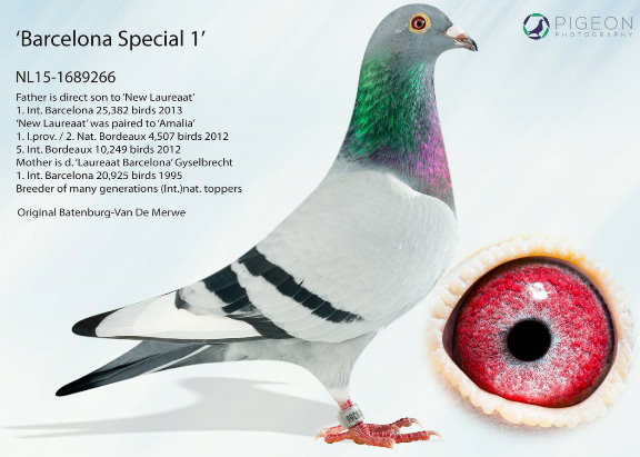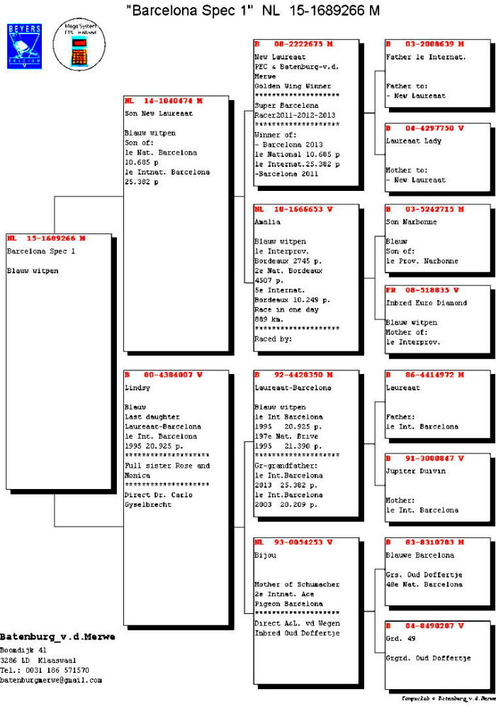 這羽"迪亞哥巴賽隆納號"在上籠的時候,已經很好地收到激勵了。事實上,盧克的一位朋友說過:這羽鴿子看起來很棒,他的狀態已經很好了。他看起來乾淨俐落還很機敏,是一羽正處在很好狀態的鴿子。說實話,可能你不會感到驚訝,這種類型的鴿子在鴿友中非常受歡迎。他獲得了許多頂級獎項,也擁有很好的血統。他的父親是亞曆克斯.蘭斯(Alex Rans)鴿舍的1995年波爾多國際冠軍"亞瑟"(Arthur)的血系。母親是卡羅.吉賽布賴特(Dr. Carlo Gijselbrecht)鴿舍的1995年巴賽隆納國際冠軍"巴賽隆納榮耀號"(Laureaat)的孫代。