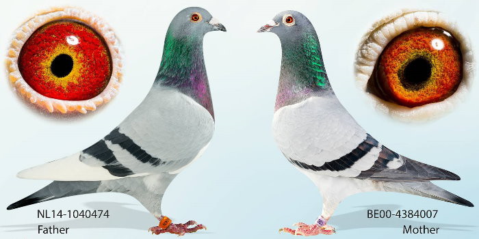 父鴿:NL14-1040474 "新榮耀號"直仔 + 母鴿:B00-4384007 "巴賽隆納榮耀號"直女