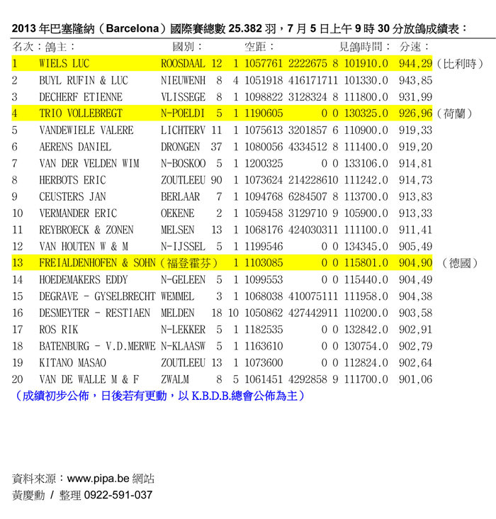 2013年歐洲巴塞隆納(Barcelona)國際賽於6月30日交鴿,7月5日各國完成交鴿作業手續並集結於西班牙巴賽隆納區,交鴿總數25.382羽,較去(2012)年25.320羽增加了62羽,放鴿時間是7月5日(星期五)上午9時30分正式放鴿,選手鴿在鴿車中足足待上6天,天氣狀況非常良好,放飛地:弱風、北-東北風、能見度非常好。