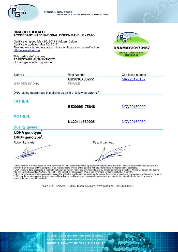 2016年"Fondunie 2000"聯盟長距離鴿王冠軍。