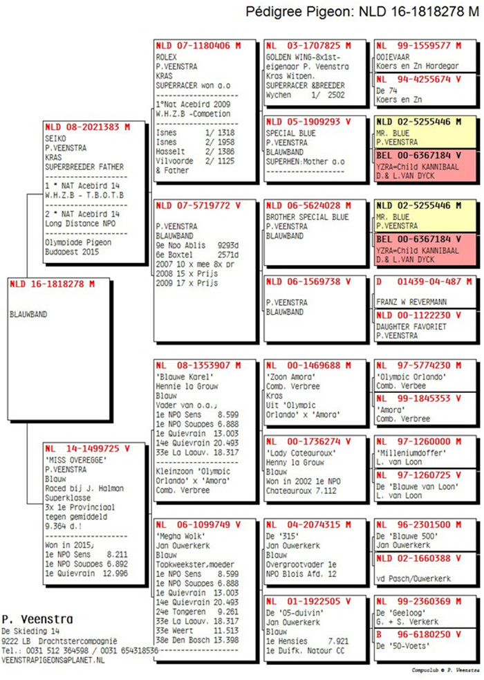 2015年這羽一歲灰色雌鴿在5周內贏得了眾多佳績。很多鴿友很難相信這羽賽鴿能夠在如此短時間內取得如此輝煌的成績。她在弗裡斯蘭省贏得了3項冠軍,包括2項NPO入賞,還有2項其他頂級成績。下面是她取得的成績的總結: