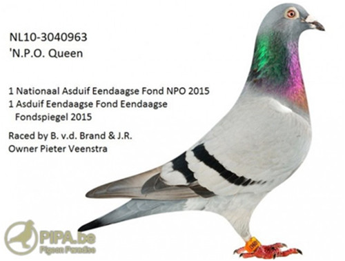 彼得.文斯特拉是荷蘭最成功的鴿友之一,不僅因為他的出色賽績而得到關注。2015年他再次收穫輝煌成績,獲得如下NPO當日歸長距離電訊賽名次:聖斯8.211羽5位和蘇普斯6.888羽季軍,而引進“歐佛萊格小姐”則讓他獲得了更多關注。這羽雌鴿為喬漢.賀曼(Johan Halman)在2015年獲得了3次弗裡斯蘭全省最高分速冠軍。此外彼得還引進了2015年NPO全國當日歸長距離最佳賽鴿NL10-3040963,這羽雌鴿被命名為“NPO女王”( N.P.O. Queen),她由荷蘭波斯特的貝瑞. 範德布朗德(Berrie v.d. Brand & J.R.)使翔