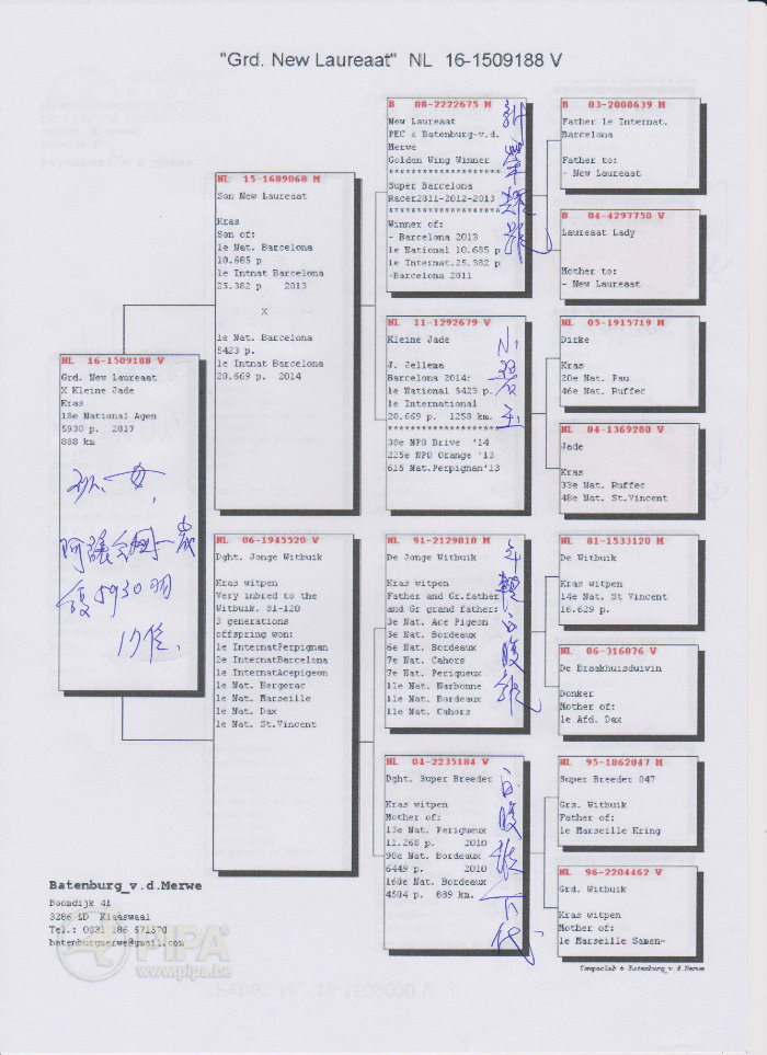 2017年阿讓全國一歲鴿17位 NL16-1509188 班母 (點擊此處,查看其血統書)