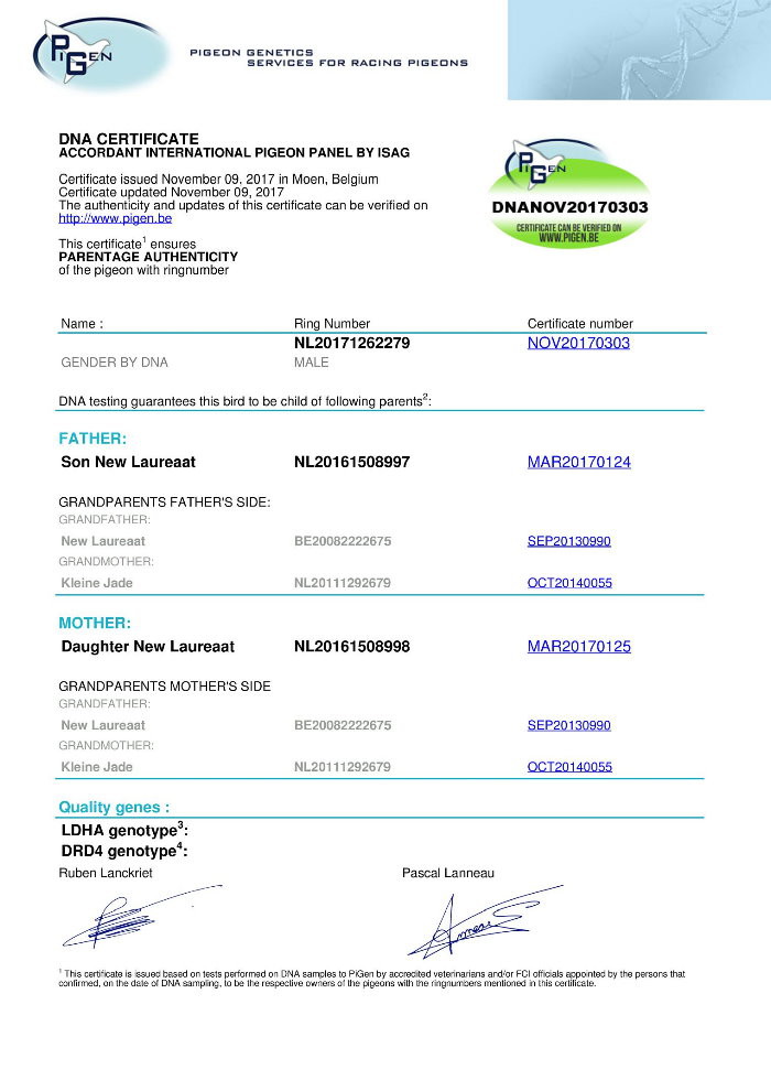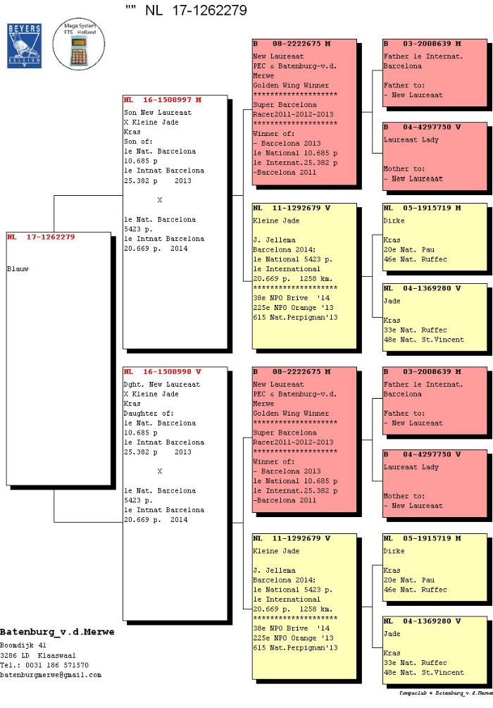 這羽"迪亞哥巴賽隆納號"在上籠的時候,已經很好地收到激勵了。事實上,盧克的一位朋友說過:這羽鴿子看起來很棒,他的狀態已經很好了。他看起來乾淨俐落還很機敏,是一羽正處在很好狀態的鴿子。說實話,可能你不會感到驚訝,這種類型的鴿子在鴿友中非常受歡迎。他獲得了許多頂級獎項,也擁有很好的血統。他的父親是亞曆克斯.蘭斯(Alex Rans)鴿舍的1995年波爾多國際冠軍"亞瑟"(Arthur)的血系。母親是卡羅.吉賽布賴特(Dr. Carlo Gijselbrecht)鴿舍的1995年巴賽隆納國際冠軍"巴賽隆納榮耀號"(Laureaat)的孫代。
