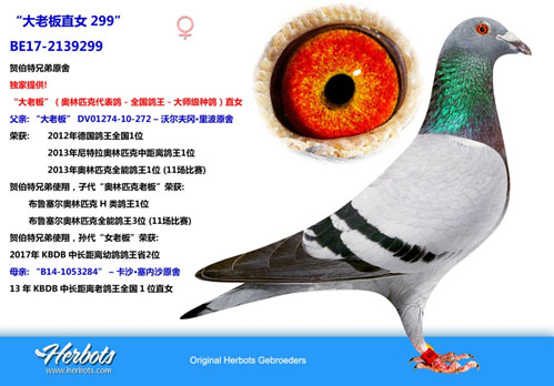 2013年比利時K.B.D.B全國中長距離鴿王冠軍。 2011年比利時K.B.D.B全國大中距離鴿王冠軍。