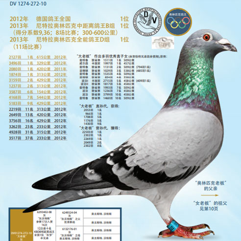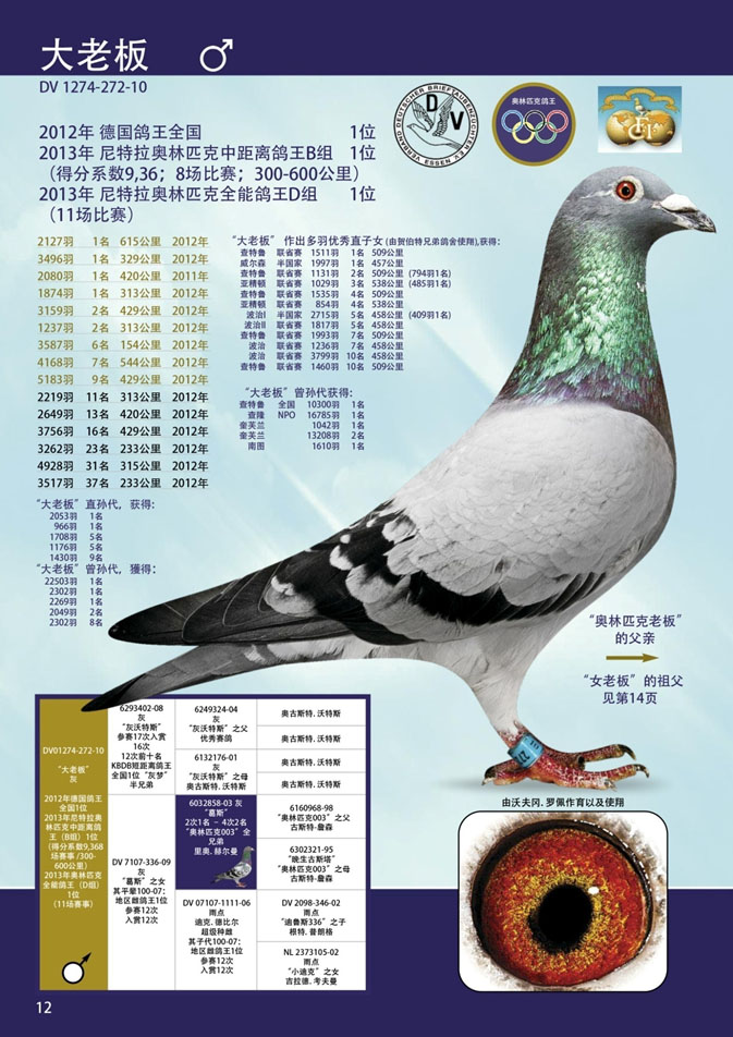 “大老闆”DV1274-10-272 灰公,2012年德國全國鴿王冠軍。