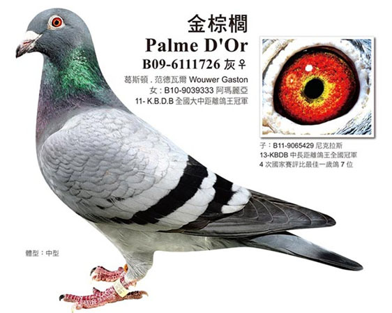“金棕櫚”B09-6111726灰母,超級種鴿,作出”尼古拉斯”及”阿瑪力亞”等兩羽全國鴿王冠軍鴿。