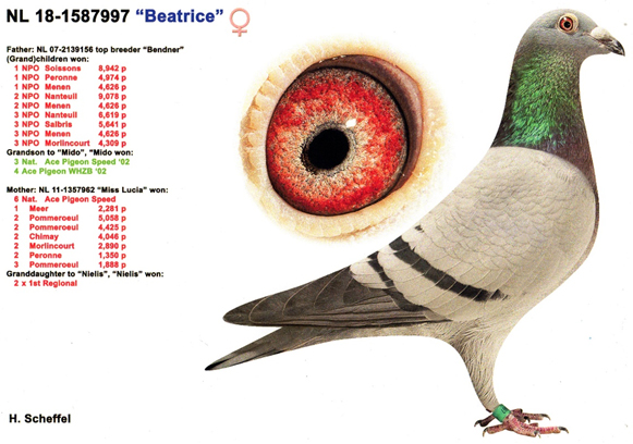 漢克.薛飛爾(Henk Scheffel)這幾年來在荷蘭鴿界出盡風頭,成績好到讓競爭對手們對參加比賽感到絕望。他擅長於速度賽與中距離比賽。 NL87-021”風中鬥士021” (Windfighter 021),其家族血源主要是詹森兄弟的幼麥克斯下代。牠的育種能力比起同孵兄弟鴿一點也不遑多讓,早已作出一系列非常優秀的後代,同孵鴿NL87-022也作出的兩羽後代為夏拉肯贏得荷蘭奧爾良全國冠軍。 超級種鴿”本德納”最引人注目的是,牠曾作出了三羽優秀的直女。 這三羽母鴿,分別命名為勞拉(Laura NL01-078),超級希爾德(Super Schalie NL07-2139164),和年輕邦費爾(Jonge Bonfire NL09-1957884),這幾羽母鴿延續了超級種鴿”本德納”血系的遺傳能力,新一代的優秀配對已躍然形成。
