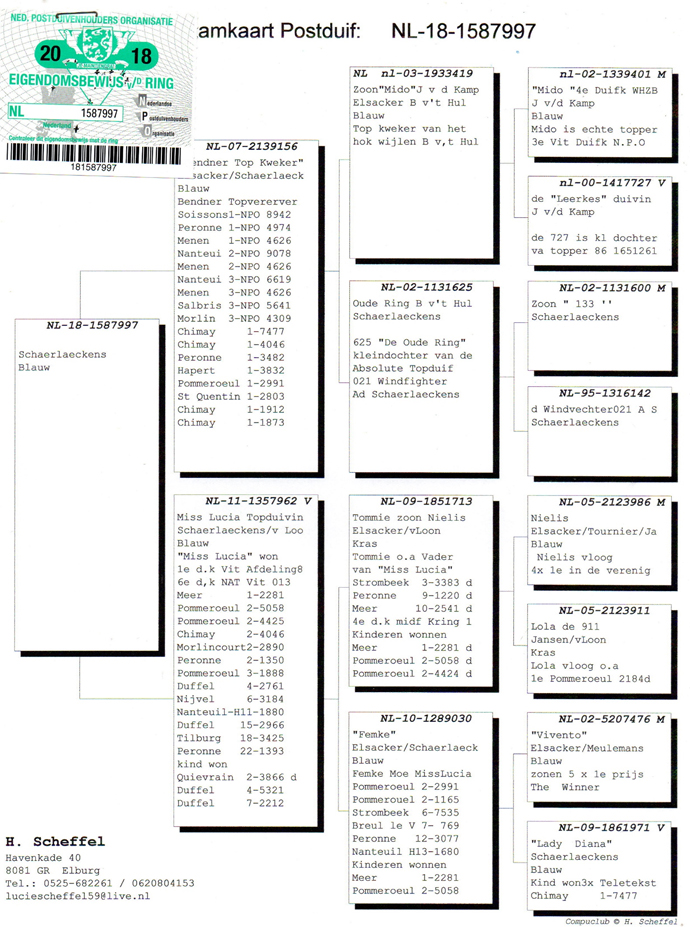 “小本德納”為荷蘭漢克. 薛飛爾的基礎種鴿。他的母親“蘿拉”(Laura)出自荷蘭艾沃特.范德霍斯特(Evert van der Horst Azn),她與艾迪.夏拉肯鴿系密切相關。 “利馬”(Lima),傑出賽雌 愛德文為“小本德納”準備的配對雌鴿之一就是“利馬”,她的血統書說明了原因。她是荷蘭佛布利父子(Verbree Combination)的“利蒙治”(Limo)的直女。“利蒙治”為傑出天賦種鴿,作育了子代“馬奇諾”(Marchino NL08-1158499)和“安妮塔”(Anita NL10-1326498)。
