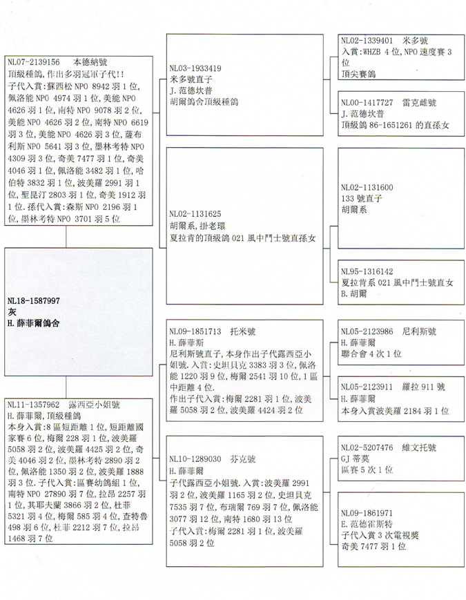 ●母鴿:NL11-1357962灰母,超級母鴿 "露西亞小姐號",薛飛爾.漢克”神奇母”, 本身入賞:短距離國家賽6位,梅爾228羽1位,波美羅5.058羽2位,波美羅4.425羽2位,奇美4.046羽2位,墨林考特2.890羽2位,佩洛能1.350羽2位,波美羅1.888羽3位。 子代入賞:區賽幼鴿組1位,南特NPO 27.890羽7位,拉揚2.257羽1位,齊耶夫蘭3.866羽2位,杜菲5.321羽4位,梅爾585羽4位,查特魯498羽6位,杜菲2.212羽7位,拉揚1.468羽7位。