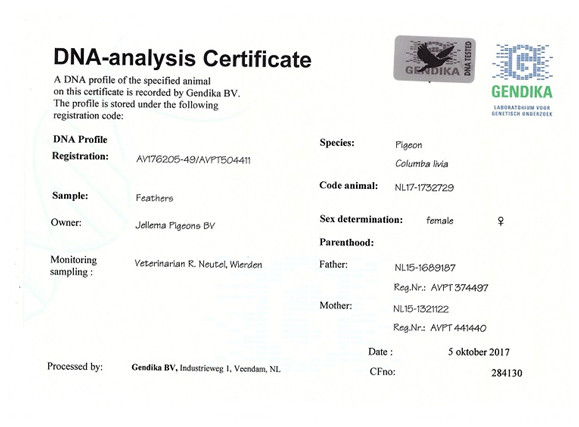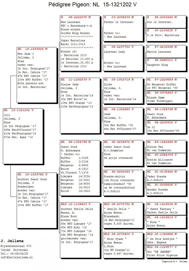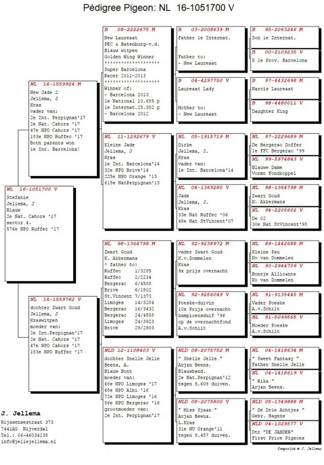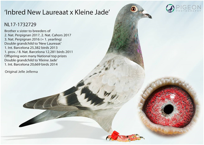 “吉爾”、“斯蒂芬妮”和“萊昂”的母親NL14-1559782為耶勒的天賦種鴿“黑金”直女。